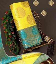 Yellow turuoise soft silk blend banarasi jacuard work designer party wear saree with unstitched blouse piece
