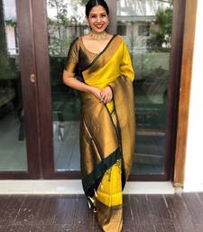 Yrllow green soft silk blend banarasi jacuard work designer party wear saree with unstitched blouse piece