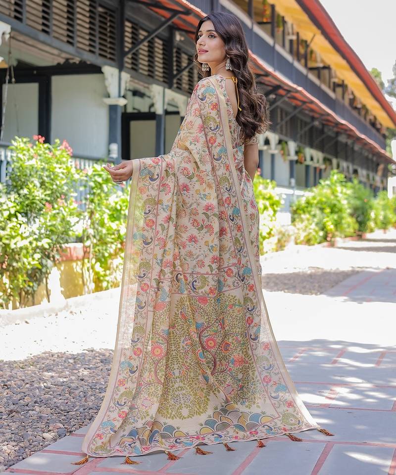 Cotton cotton blend handloom saree with floral motif and tassel border