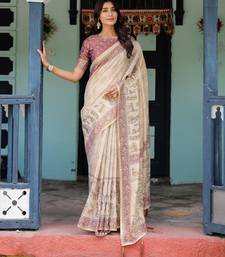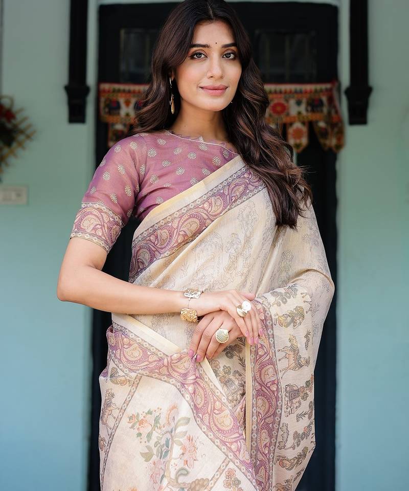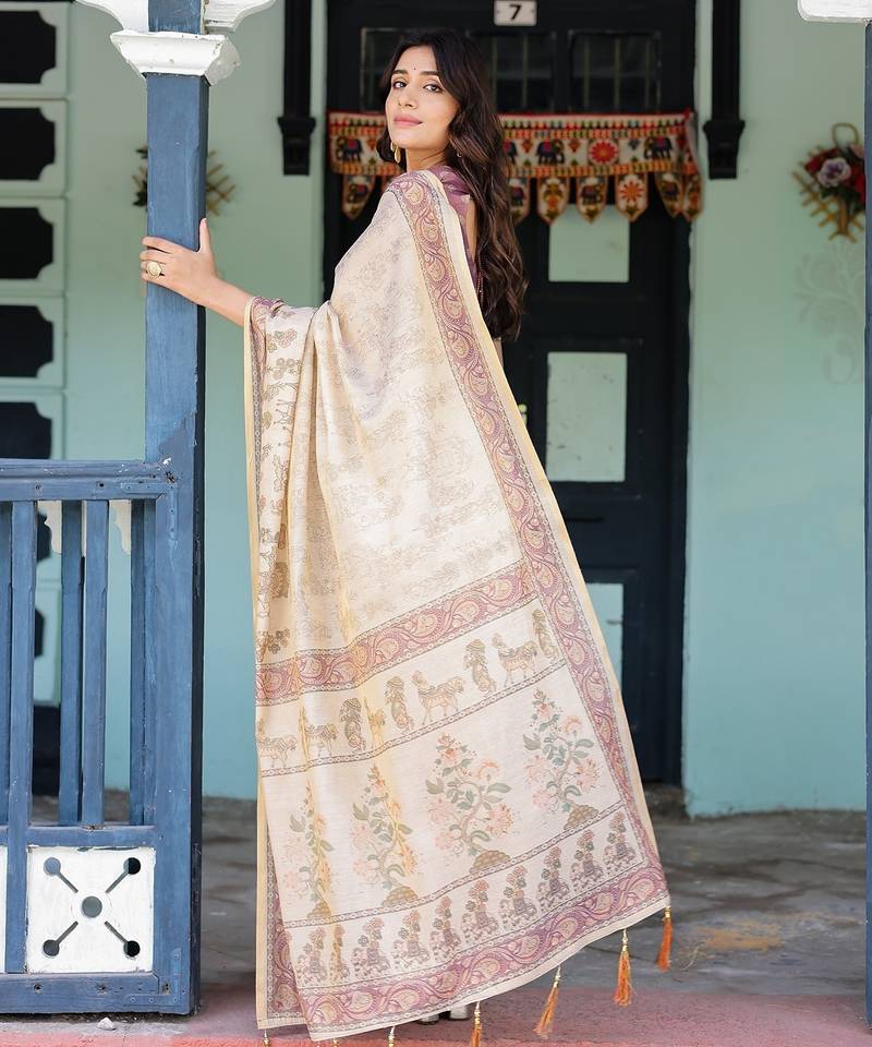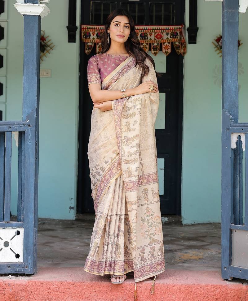 Designer floral print handloom cotton saree with tassel pallu & blouse