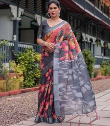 Designer floral print handloom linen saree with tassel pallu & blouse