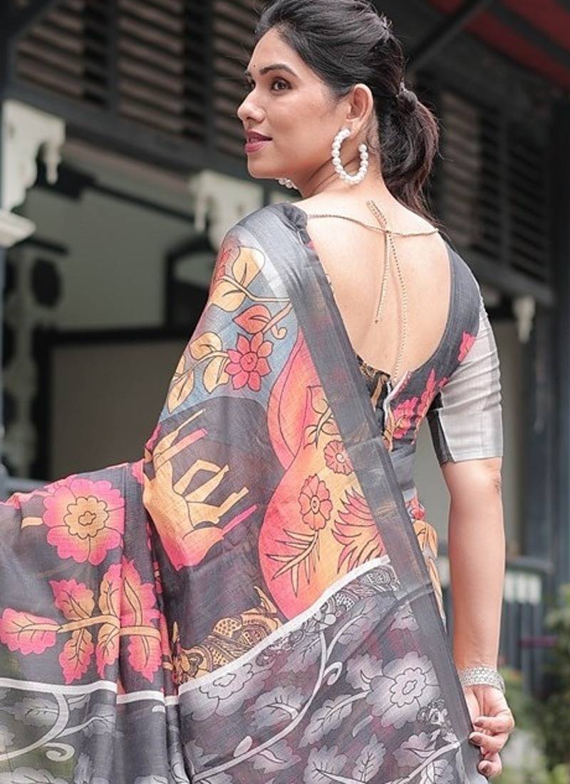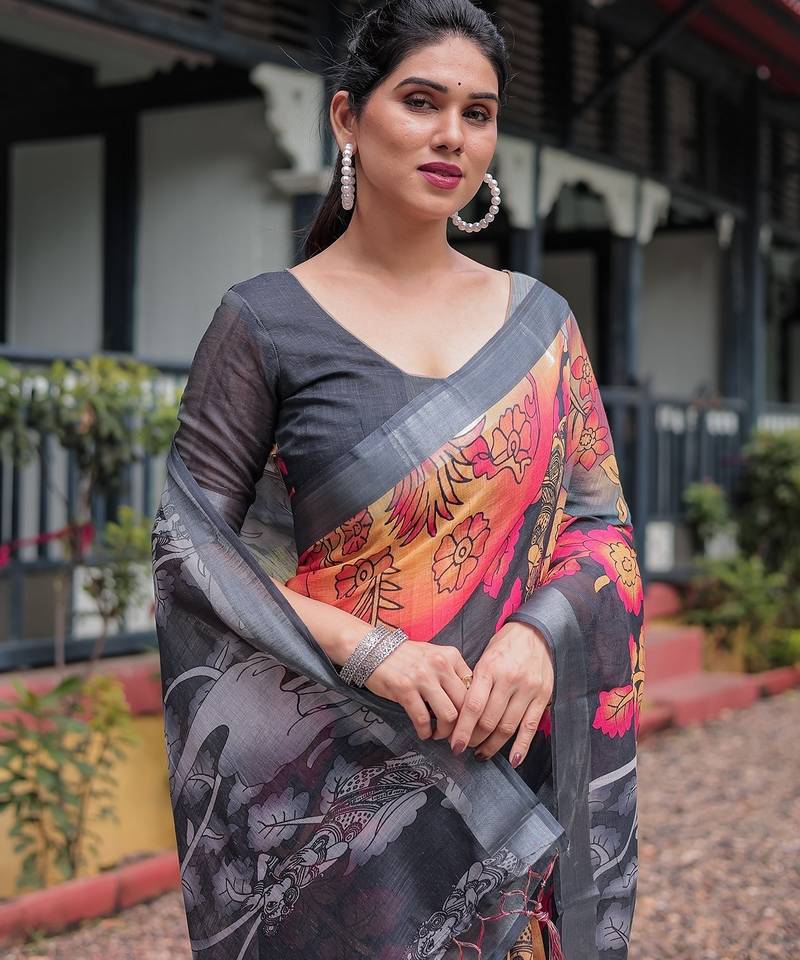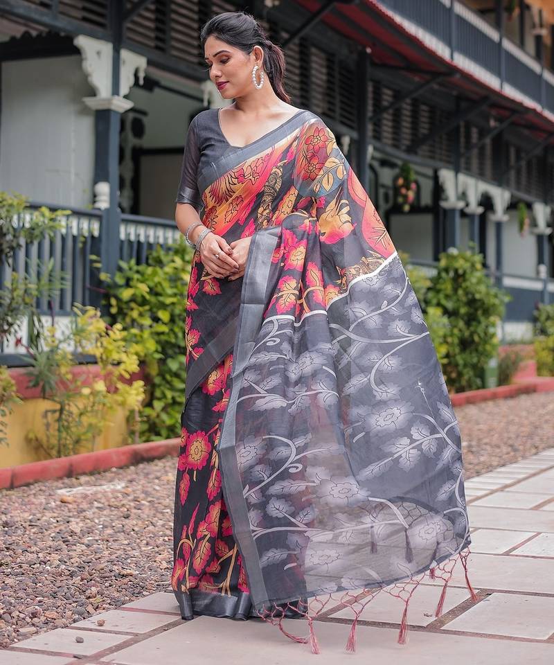 | Product Name | Designer Floral Print Handloom Linen Saree With Tassel Pallu & Blouse | |