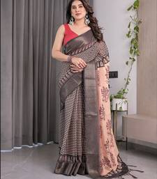 Designer floral print handloom linen weaved with golden zari saree with tassel pallu & blouse