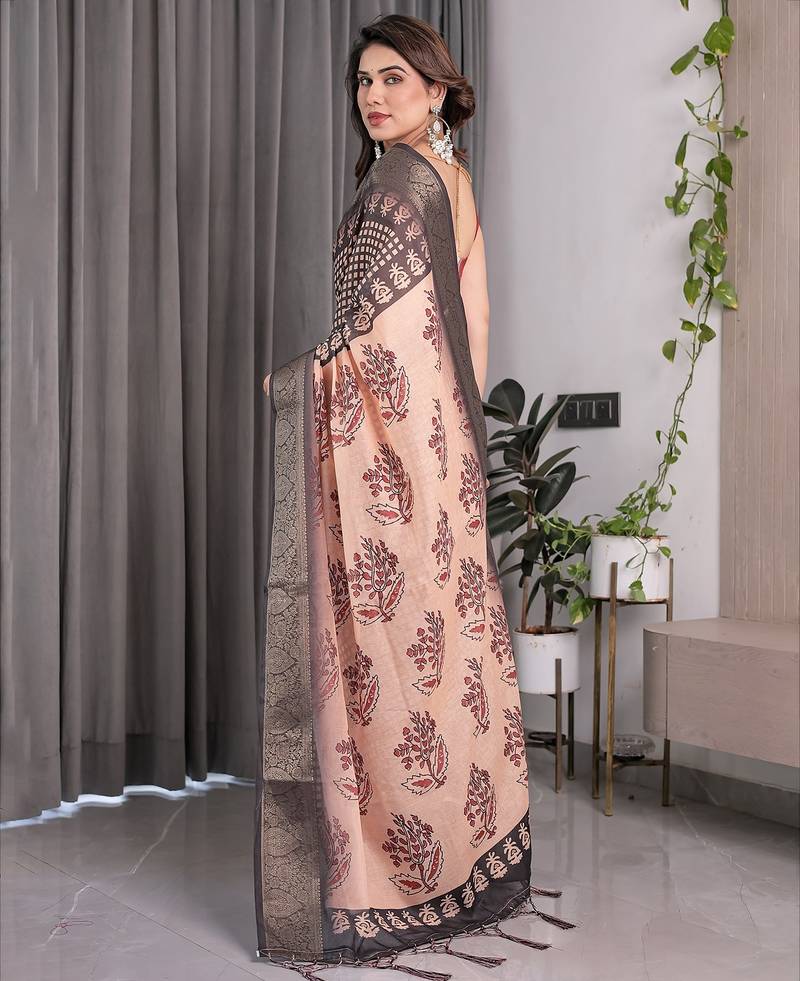 | Product Name | Designer Floral Print Handloom Linen Weaved With Golden Zari Saree With Tassel Pallu & Blouse | |