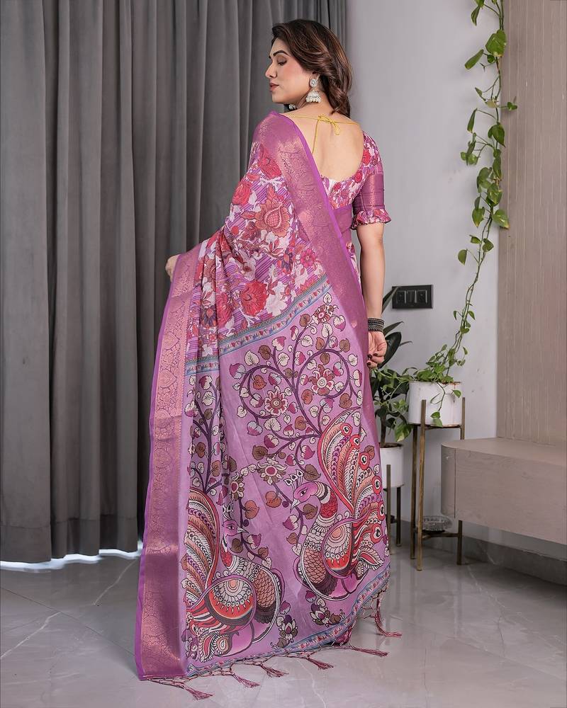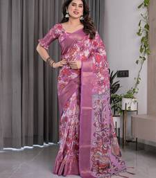Designer floral print handloom linen weaved with golden zari saree with tassel pallu & blouse