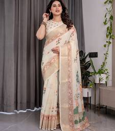 Elegant handloom linen weaved with golden zari saree with floral print & tassel edges 5.5m + 0.8m blouse