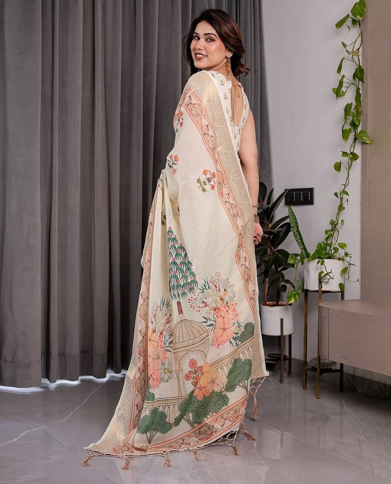 | Product Name | Elegant Handloom Linen Weaved With Golden Zari Saree With Floral Print & Tassel Edges 5.5m + 0.8m Blouse | |