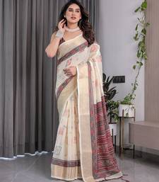 Elegant handloom linen weaved with golden zari saree with floral print & tassel edges 5.5m + 0.8m blouse