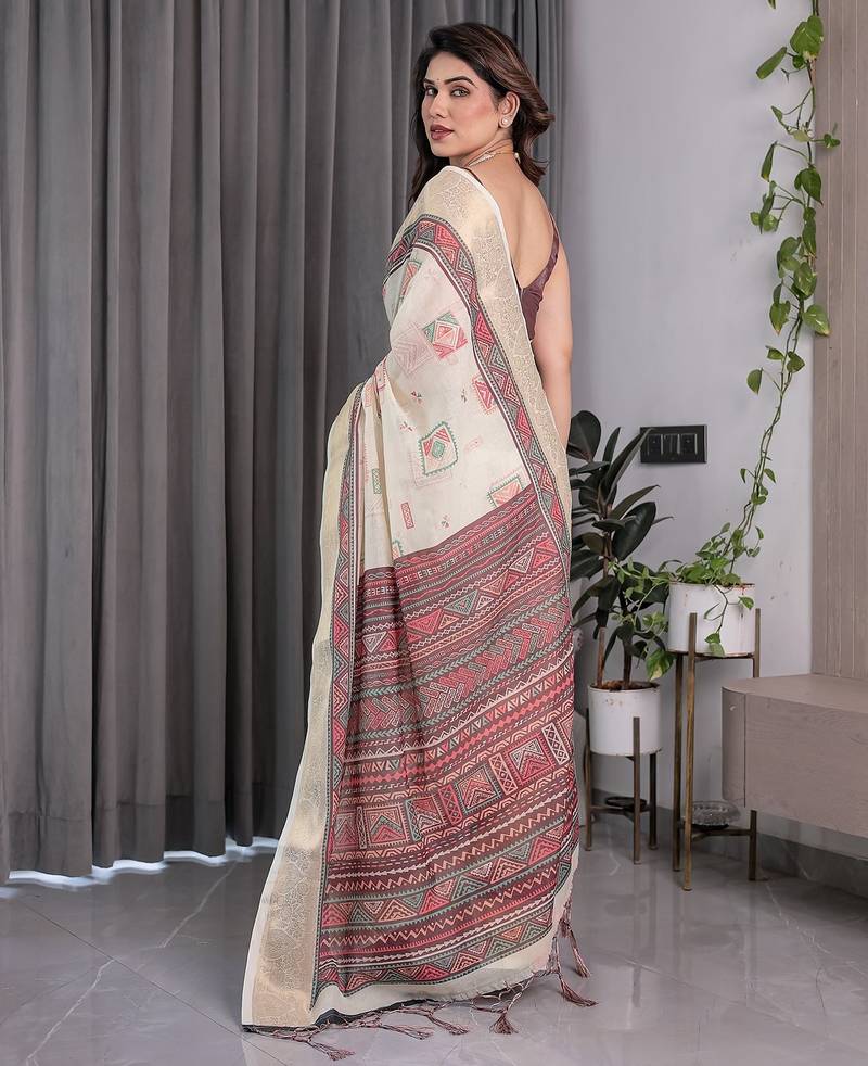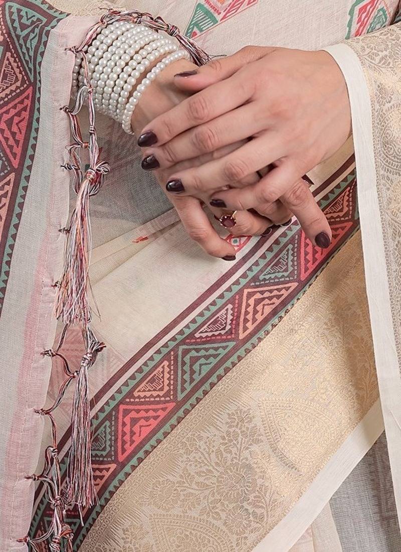 | Product Name | Elegant Handloom Linen Weaved With Golden Zari Saree With Floral Print & Tassel Edges 5.5m + 0.8m Blouse | |