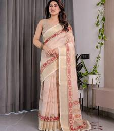 Elegant handloom linen weaved with golden zari saree with floral print & tassel edges 5.5m + 0.8m blouse