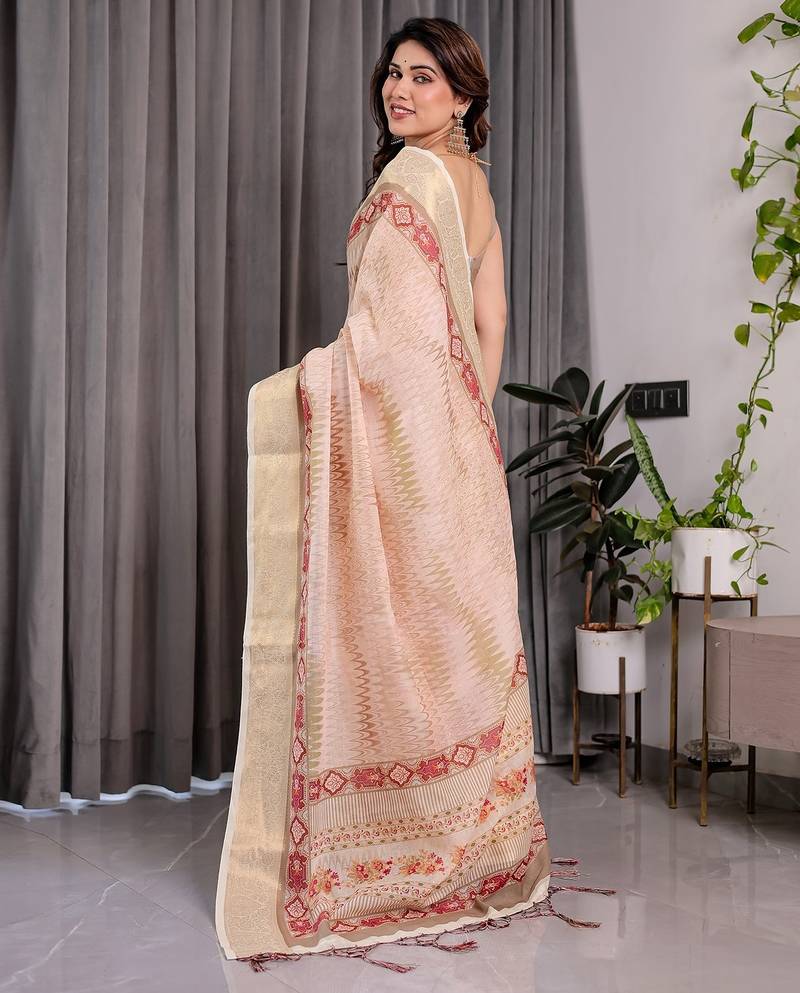 | Product Name | Elegant Handloom Linen Weaved With Golden Zari Saree With Floral Print & Tassel Edges 5.5m + 0.8m Blouse | |