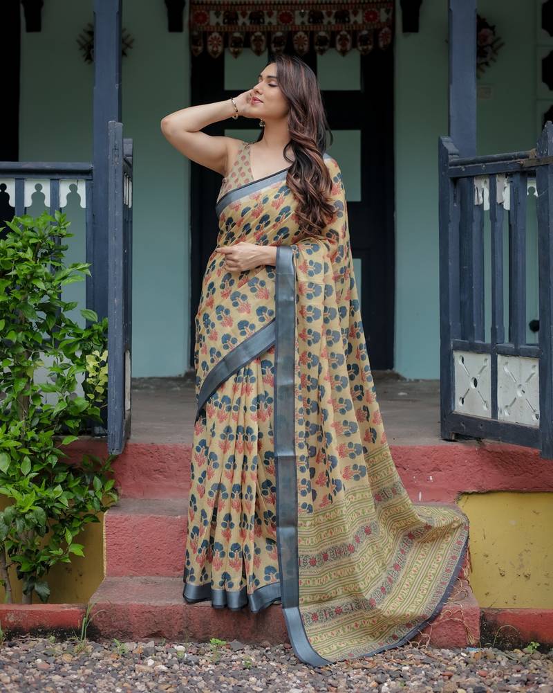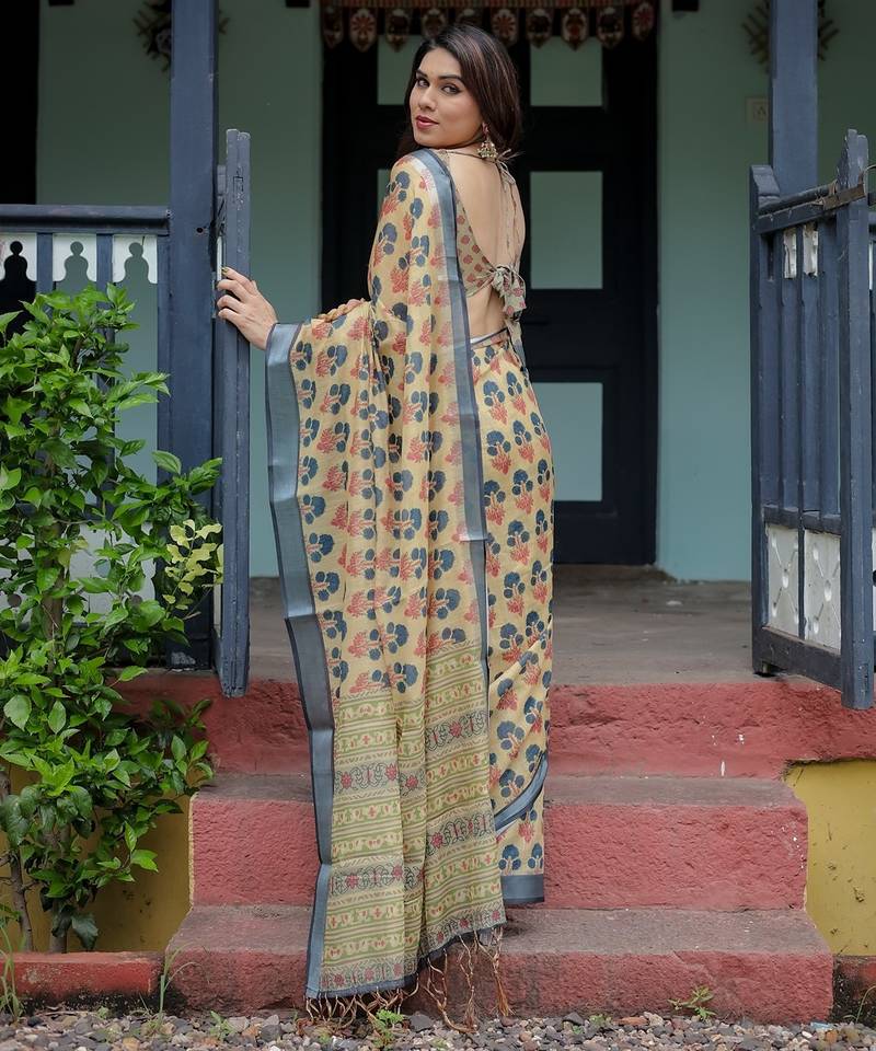 | Product Name | Ethnic Handloom Linen Saree With Colorful Floral Print And Matching Blouse | |