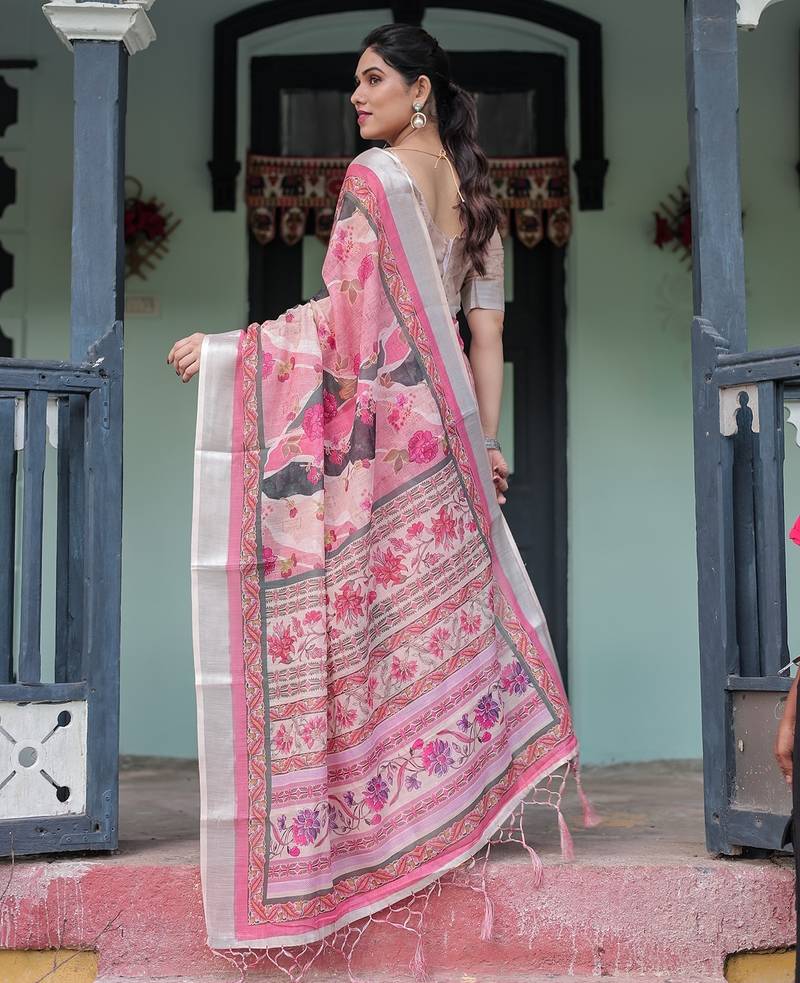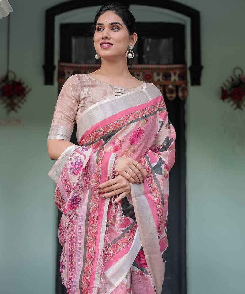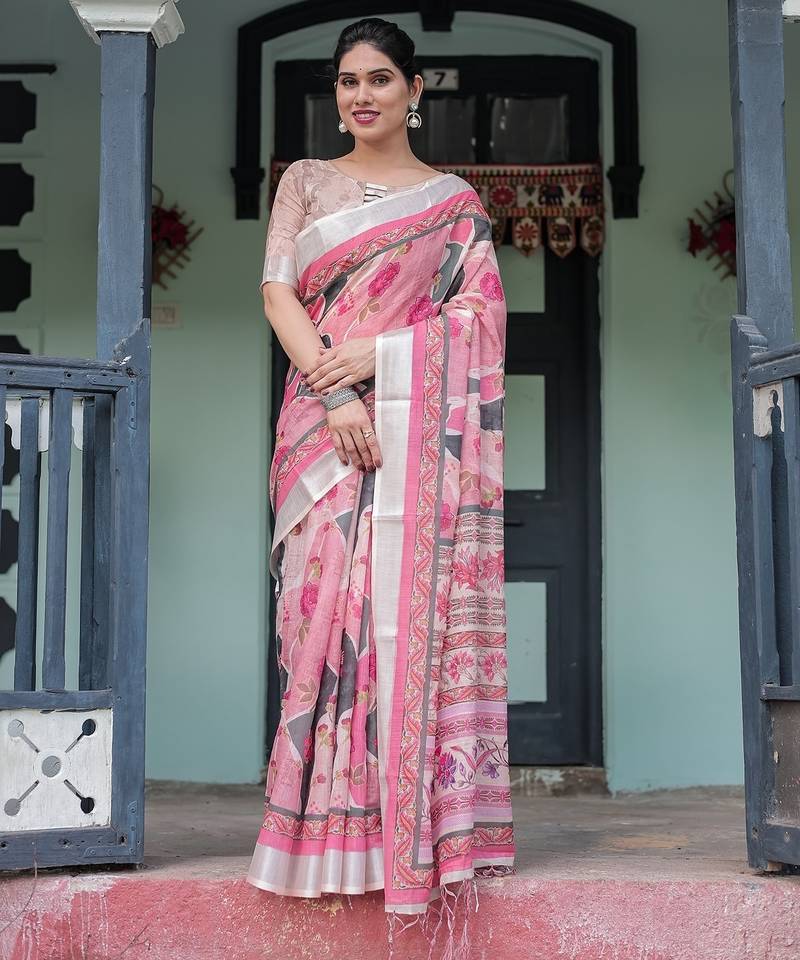 | Product Name | Ethnic Handloom Linen Saree With Colorful Floral Print And Matching Blouse | |