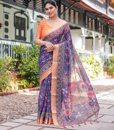 Ethnic handloom linen saree with colorful floral print and matching blouse