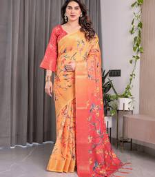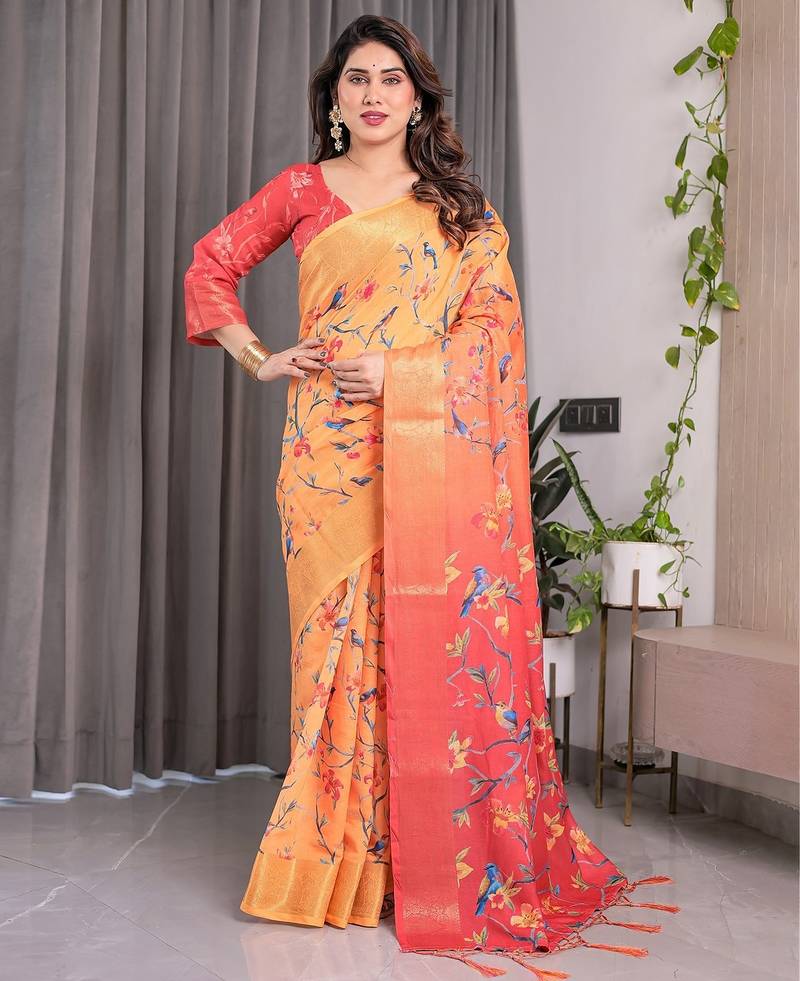 | Product Name | Ethnic Handloom Linen Weaved With Golden Zari Saree With Colorful Floral Print And Matching Blouse | |