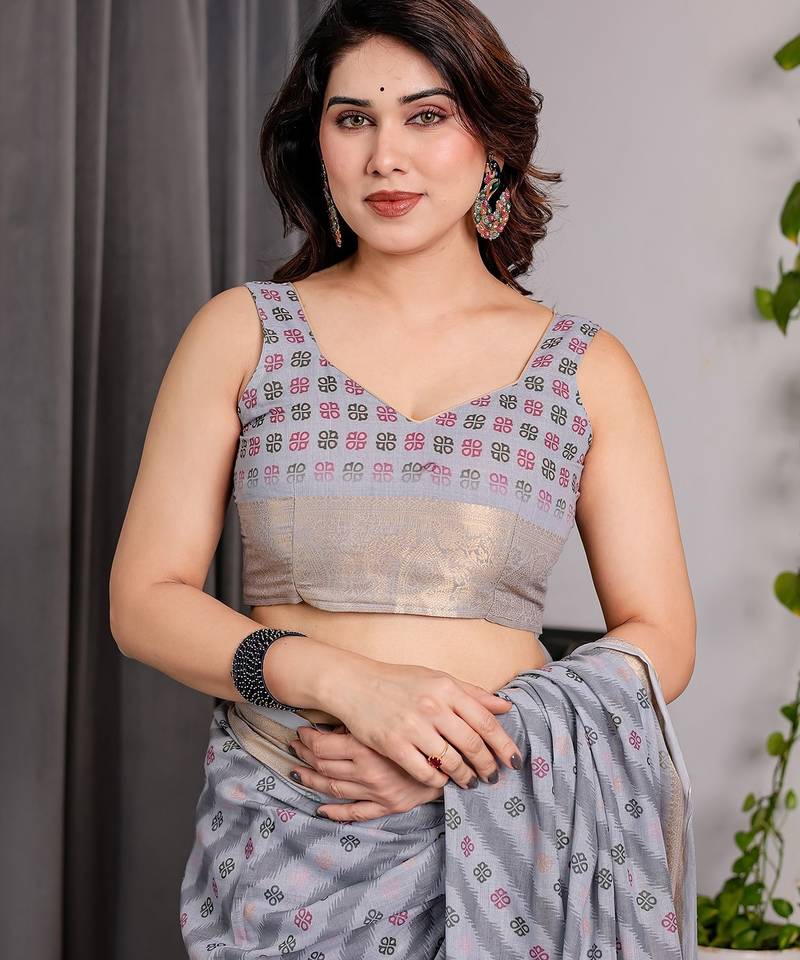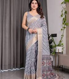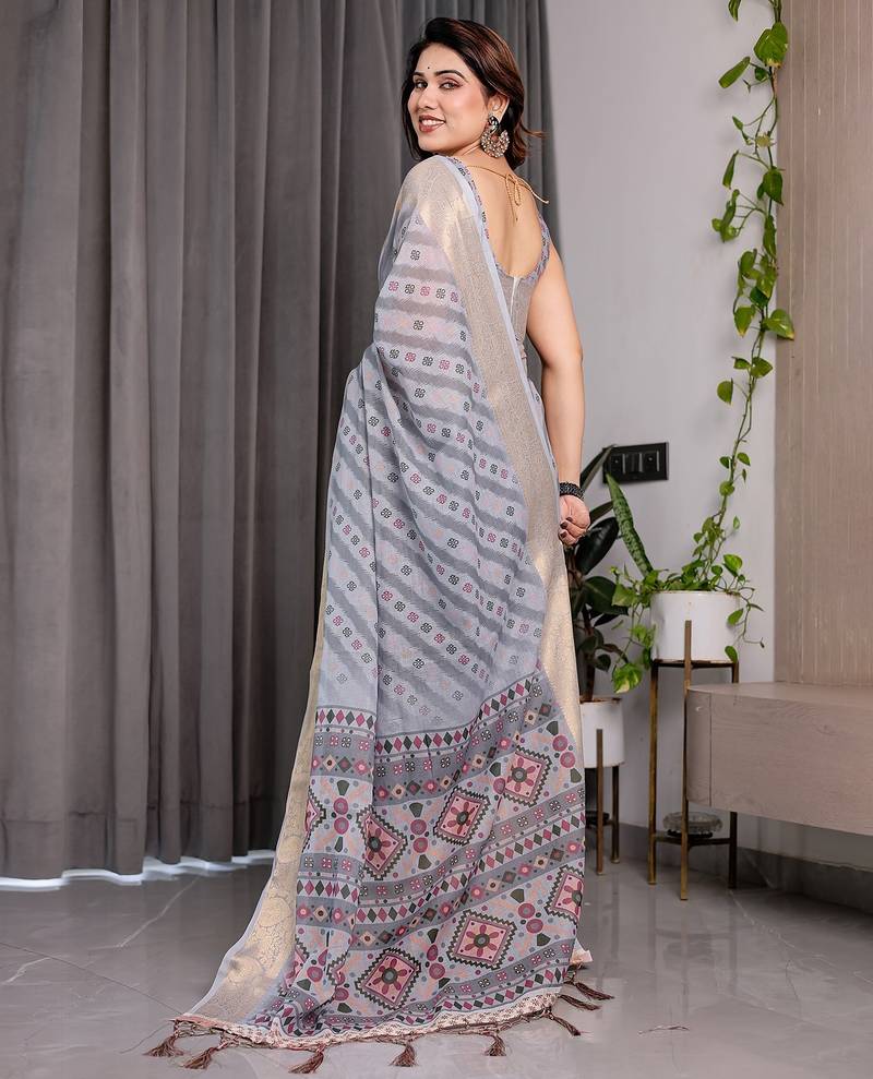 | Product Name | Ethnic Handloom Linen Weaved With Golden Zari Saree With Colorful Floral Print And Matching Blouse | |