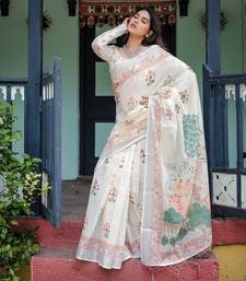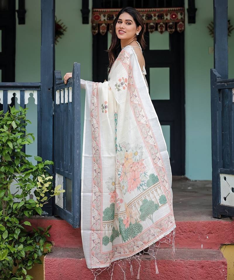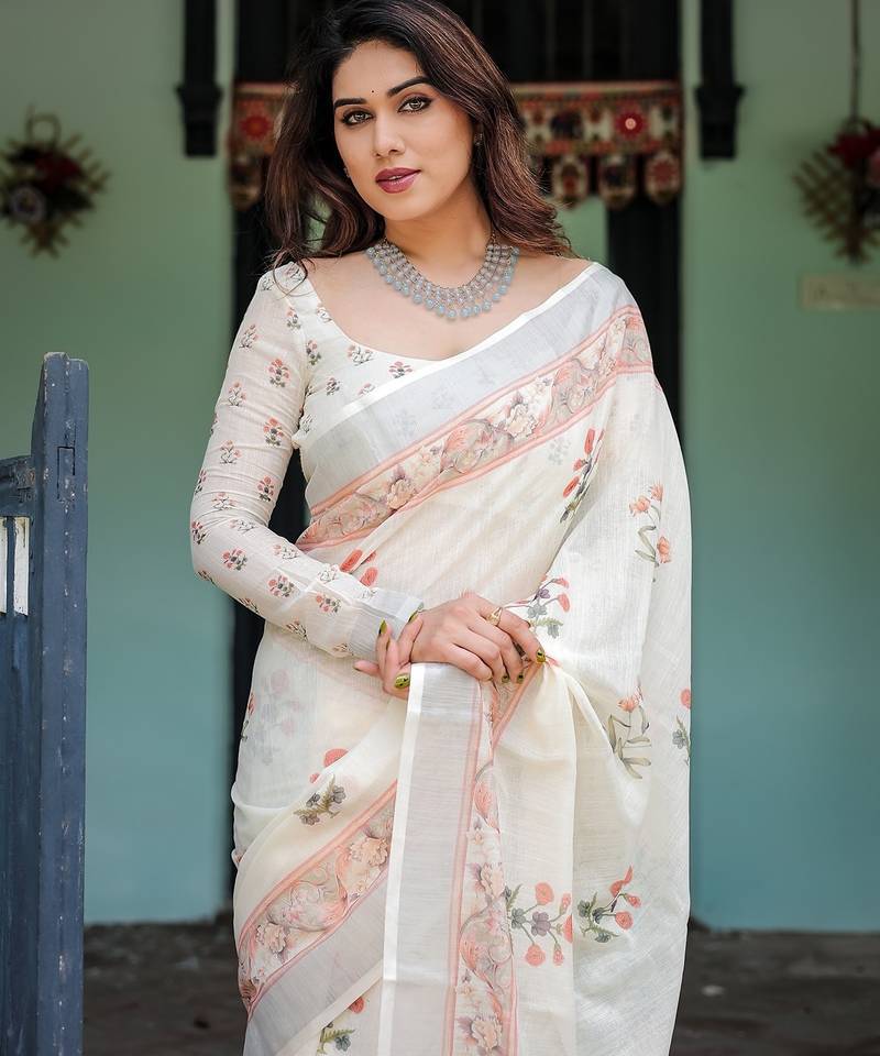 Everyday elegance handloom linen floral saree with blouse piece 5.5m