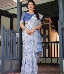 Festive ready handloom linen saree with floral artwork & matching blouse