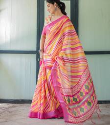 Festive ready handloom linen saree with floral artwork & matching blouse