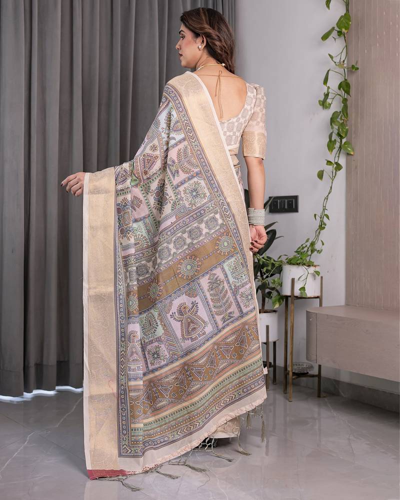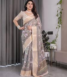Festive ready handloom linen weaved with golden zari saree with floral artwork & matching blouse