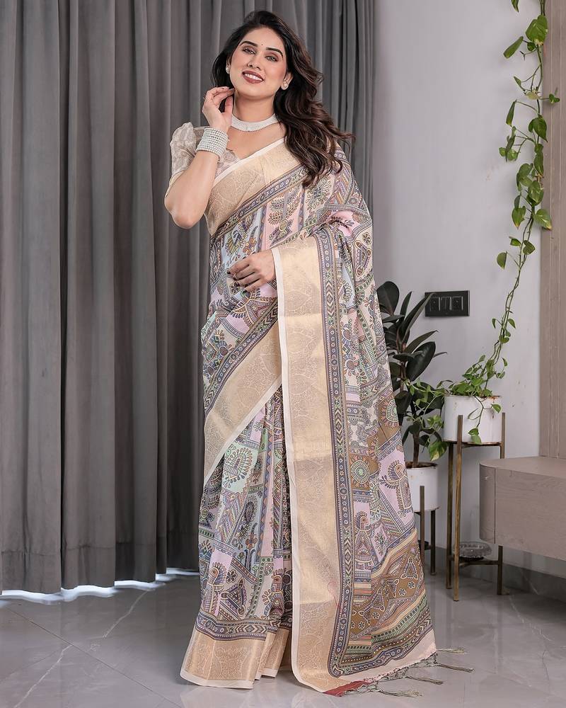 | Product Name | Festive Ready Handloom Linen Weaved With Golden Zari Saree With Floral Artwork & Matching Blouse | |