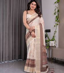 Festive ready handloom linen weaved with golden zari saree with floral artwork & matching blouse