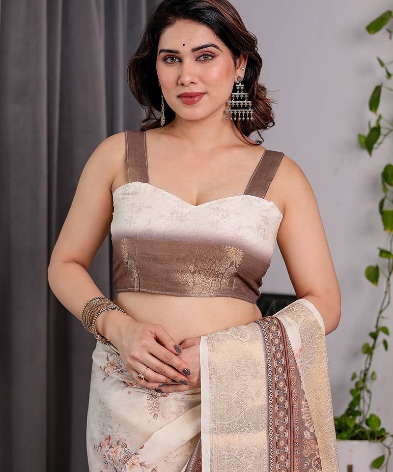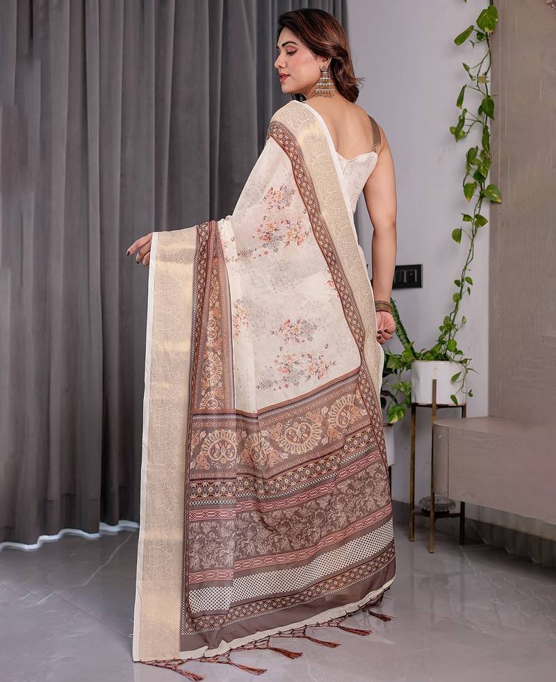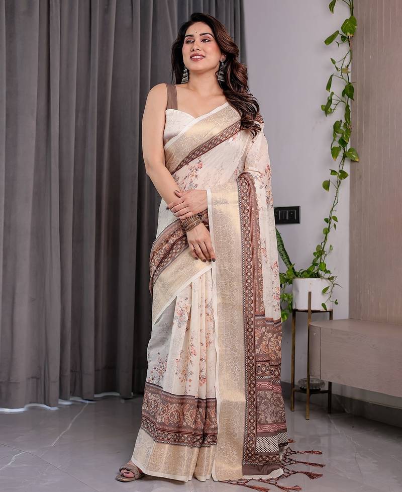 | Product Name | Festive Ready Handloom Linen Weaved With Golden Zari Saree With Floral Artwork & Matching Blouse | |