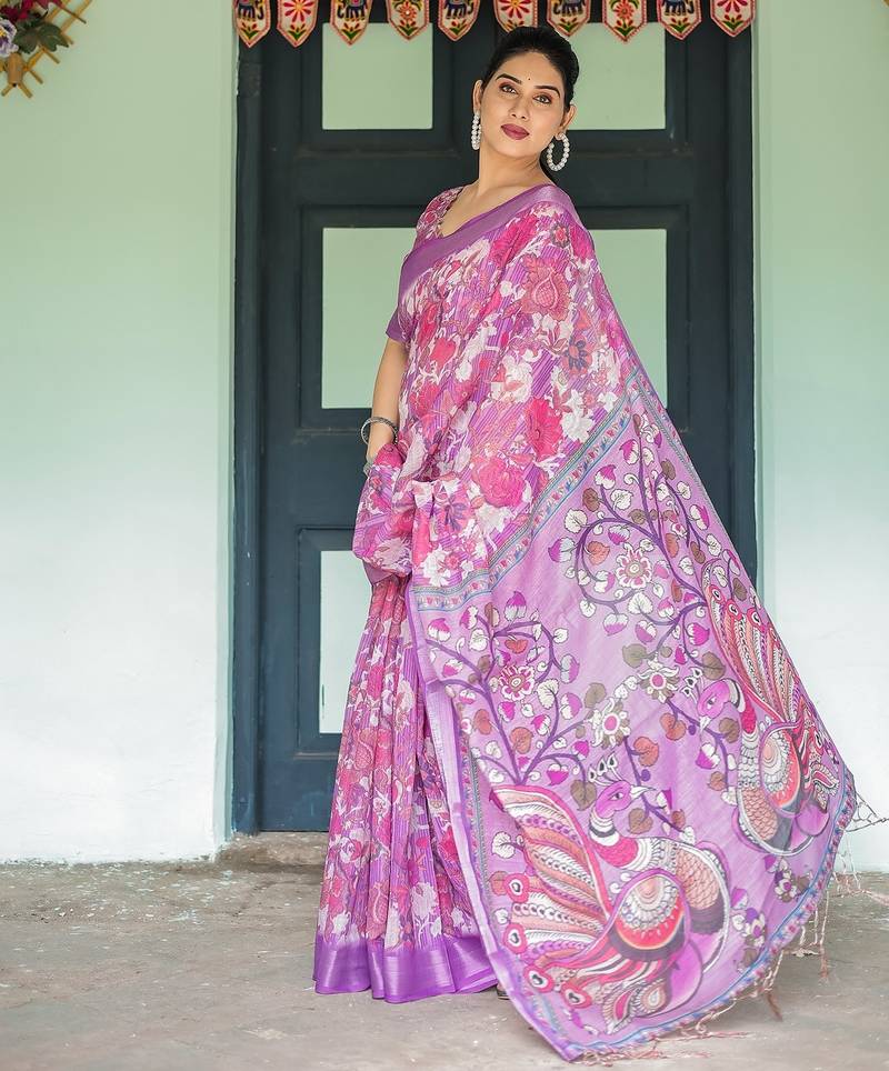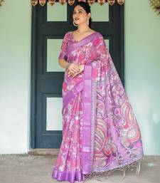 Floral printed linen saree in handloom weave with blouse piece 5.5m
