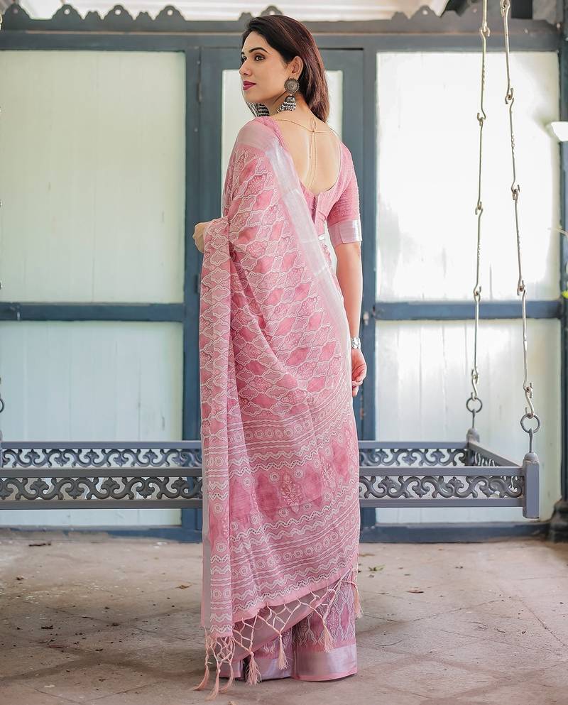 Floral printed linen saree in handloom weave with blouse piece 5.5m