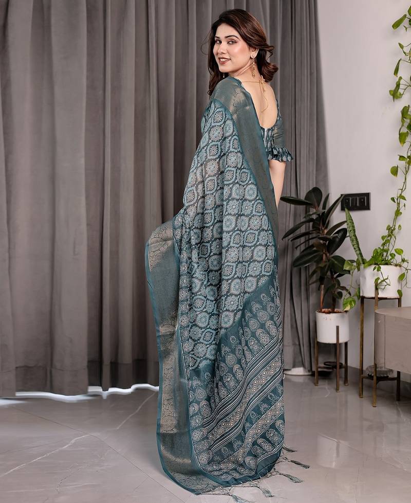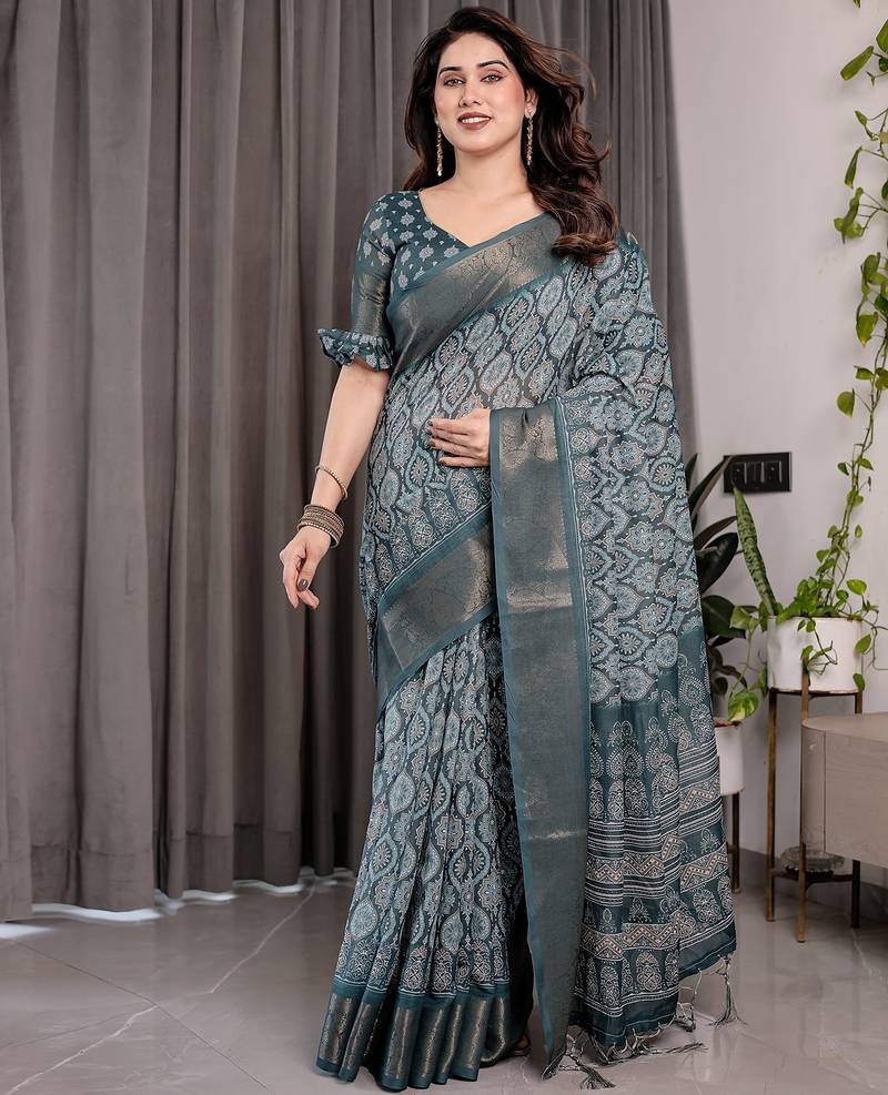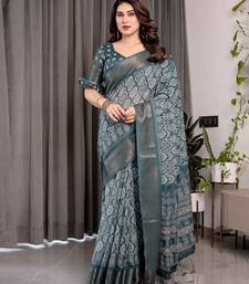 | Product Name | Floral Printed Linen Weaved With Golden Zari Saree In Handloom Weave With Blouse Piece 5.5m | |