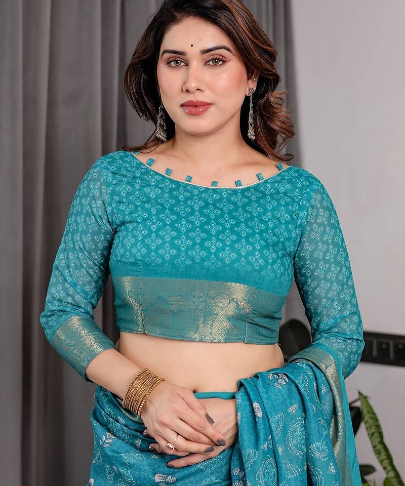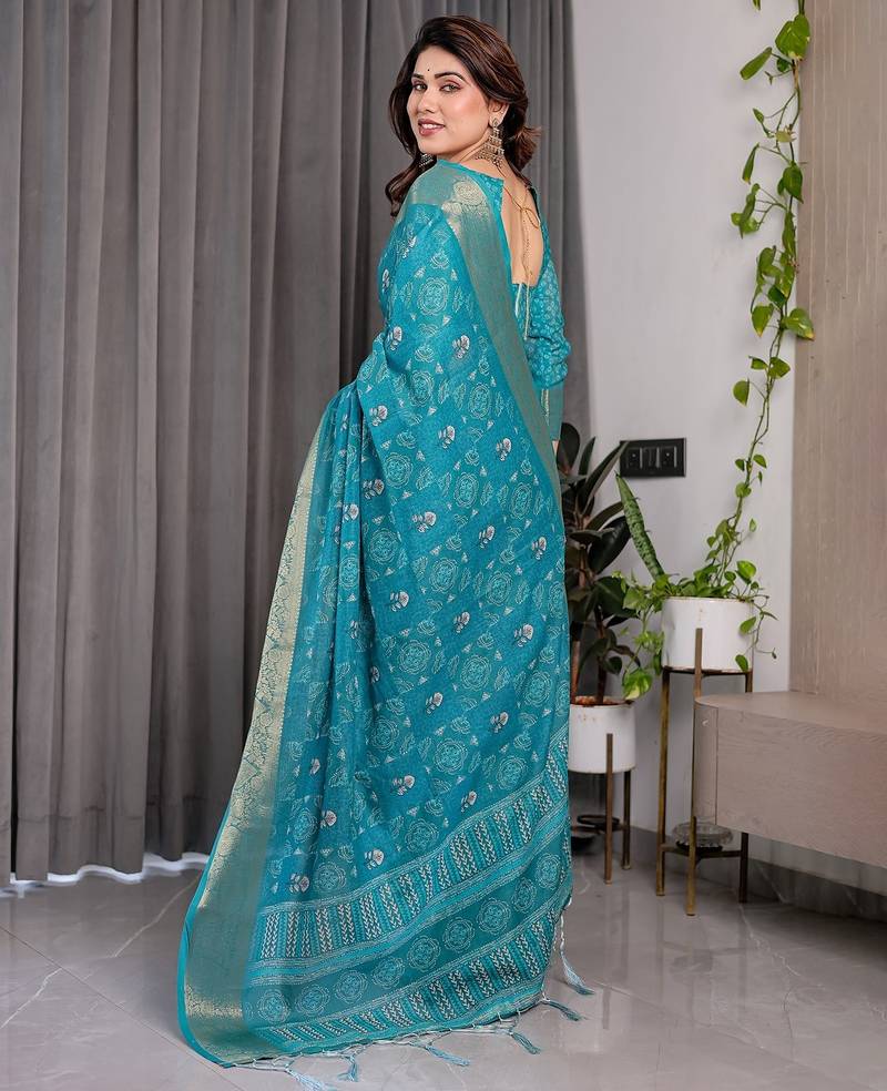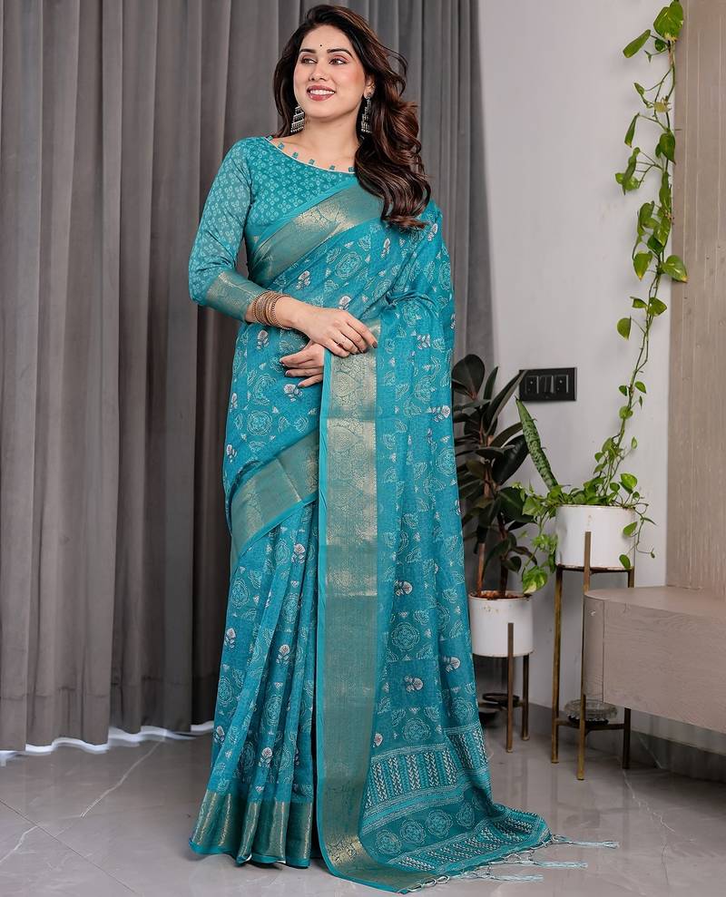 | Product Name | Floral Printed Linen Weaved With Golden Zari Saree In Handloom Weave With Blouse Piece 5.5m | |