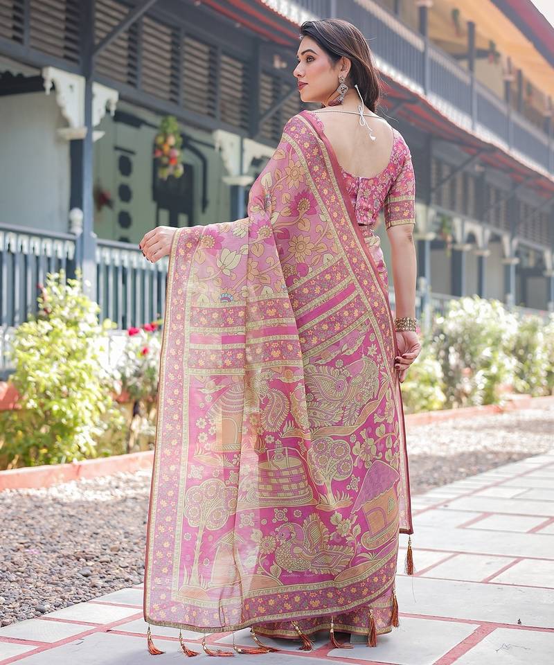 Graceful handloom cotton saree with artistic floral print & tassels
