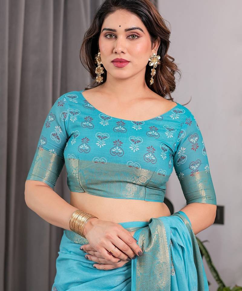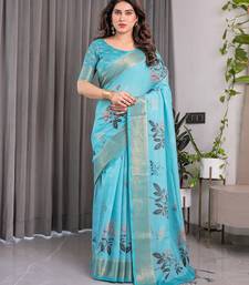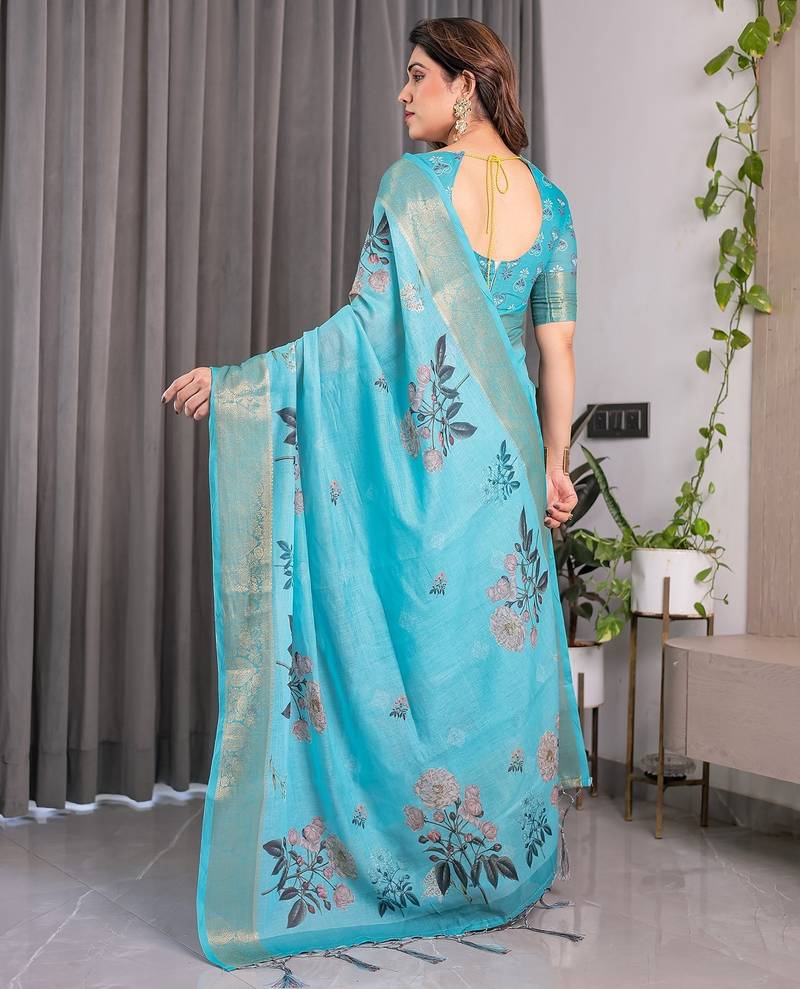 Graceful handloom linen weaved with golden zari saree with artistic floral print & tassels