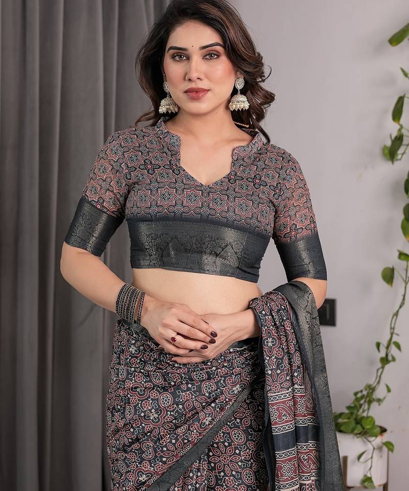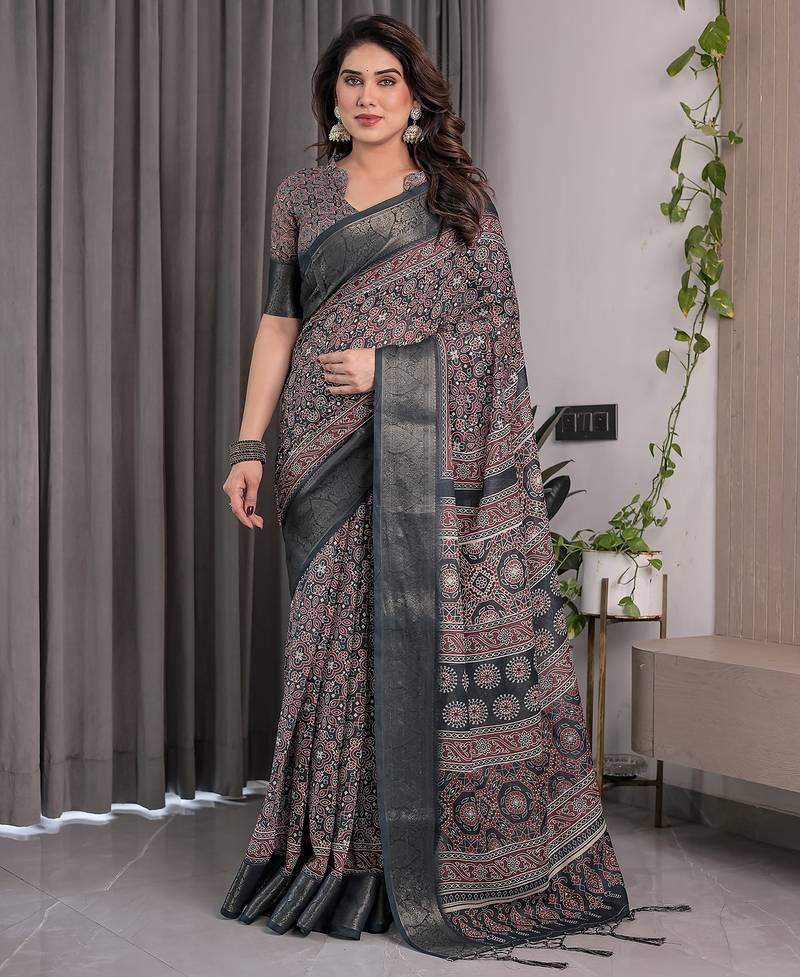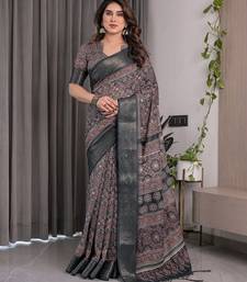 Graceful handloom linen weaved with golden zari saree with artistic floral print & tassels