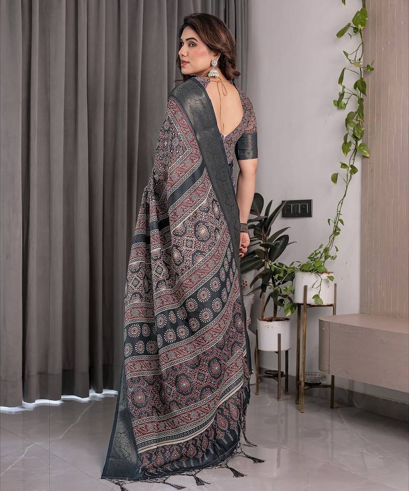 | Product Name | Graceful Handloom Linen Weaved With Golden Zari Saree With Artistic Floral Print & Tassels | |