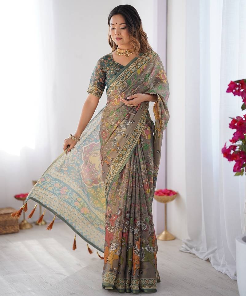 Handloom cotton floral printed saree with tassels & attached blouse 5.5m