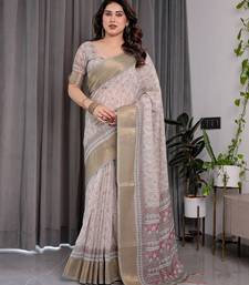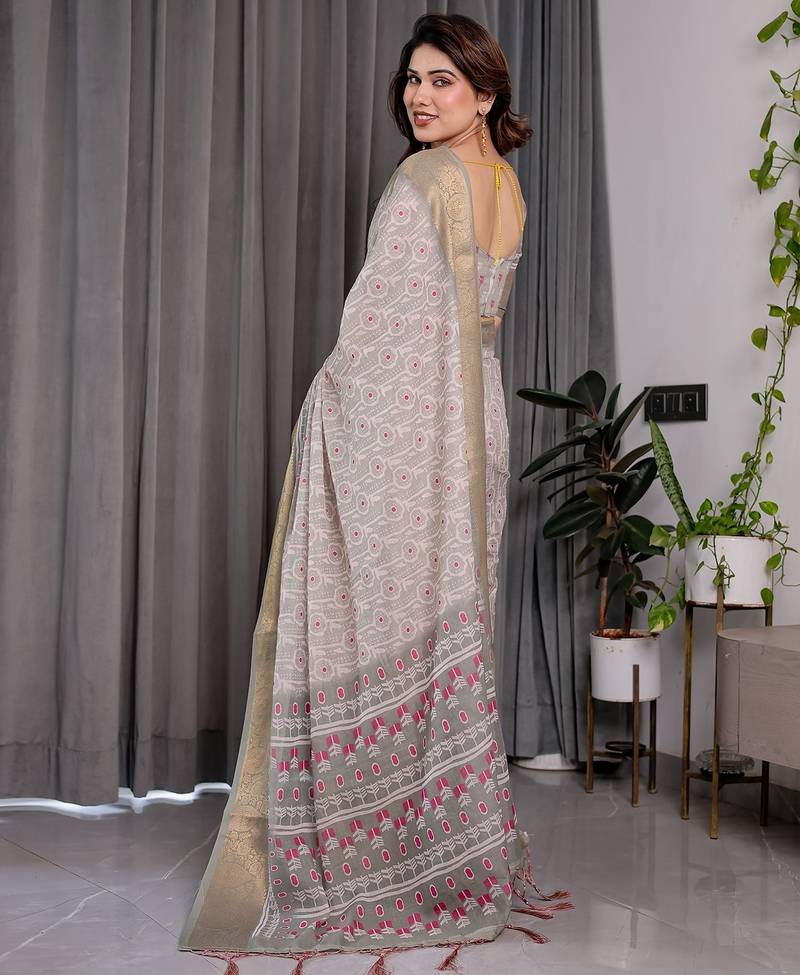 | Product Name | Handloom Linen Weaved With Golden Zari Floral Printed Saree With Tassels & Attached Blouse 5.5m | |