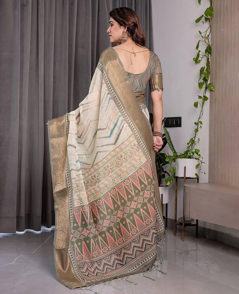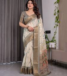 | Product Name | Handloom Linen Weaved With Golden Zari Floral Printed Saree With Tassels & Attached Blouse 5.5m | |