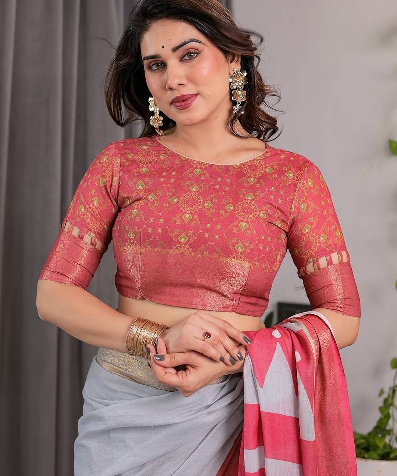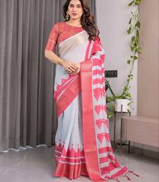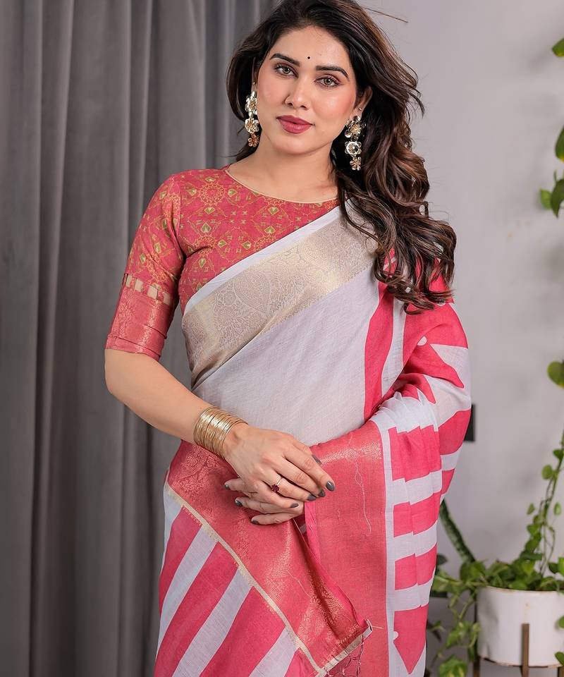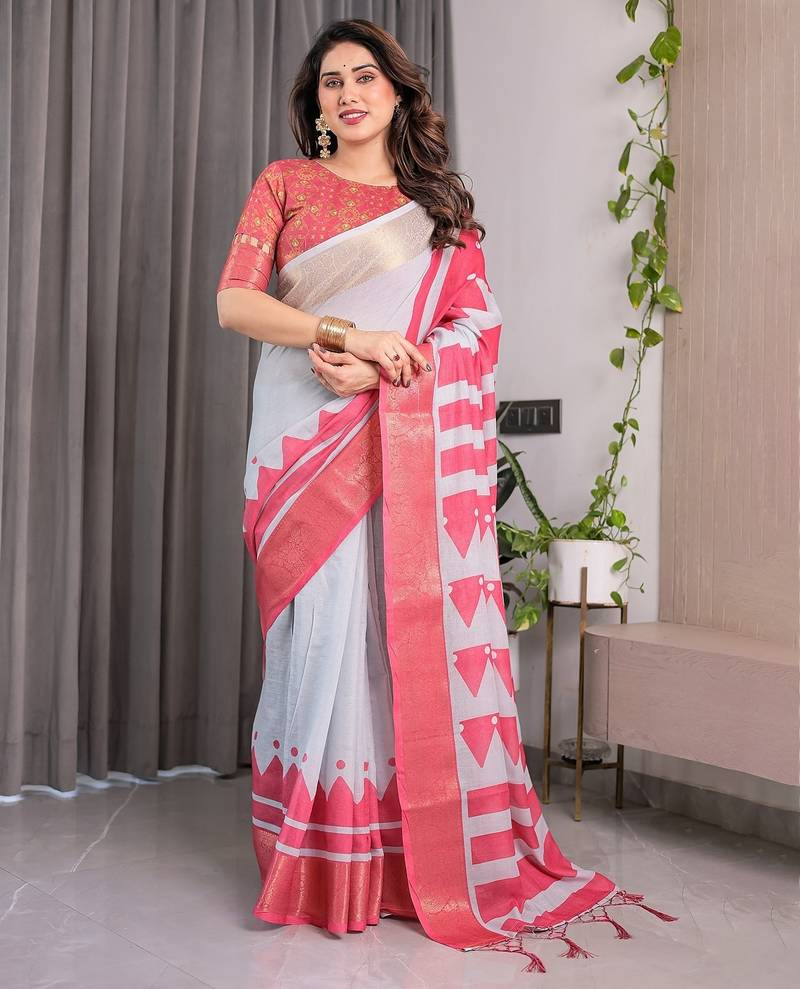 | Product Name | Linen Weaved With Golden Zari Handloom Saree With Digital Floral Print And Tassels Festive Wear | |