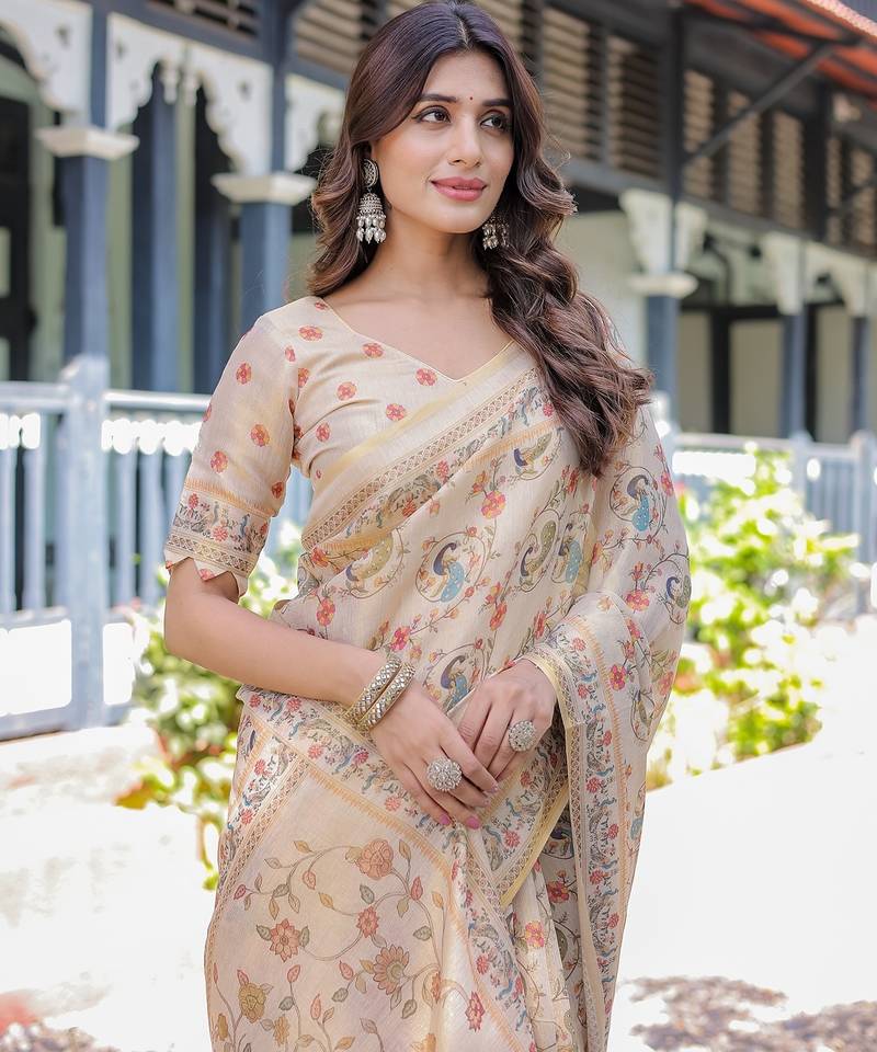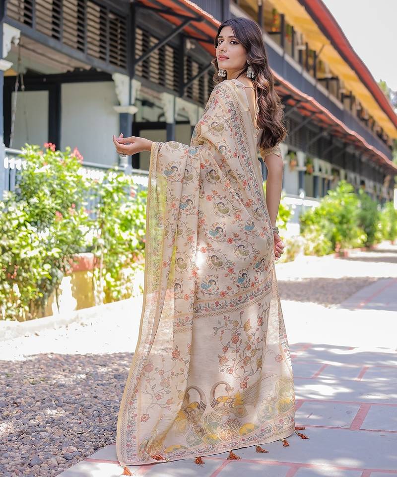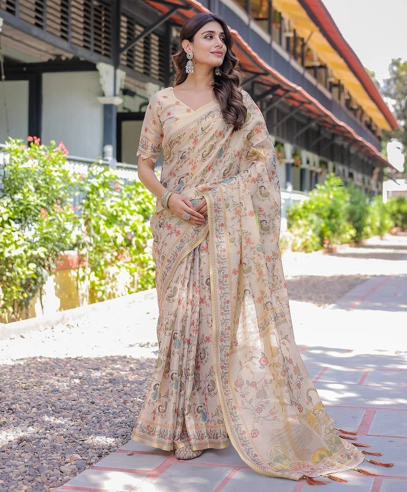 Premium floral print handloom cotton saree with pallu tassels 5.5m