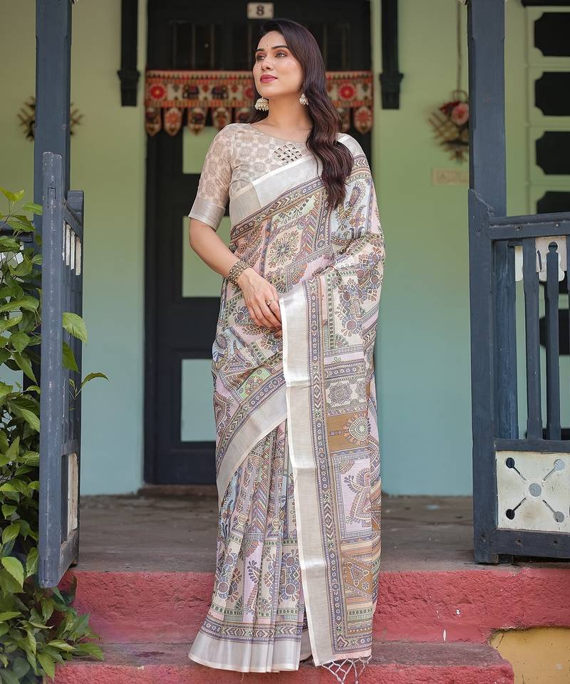 Premium floral print handloom linen saree with pallu tassels 5.5m