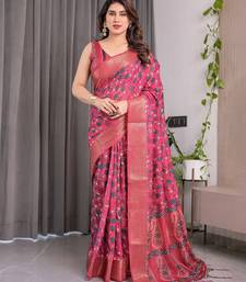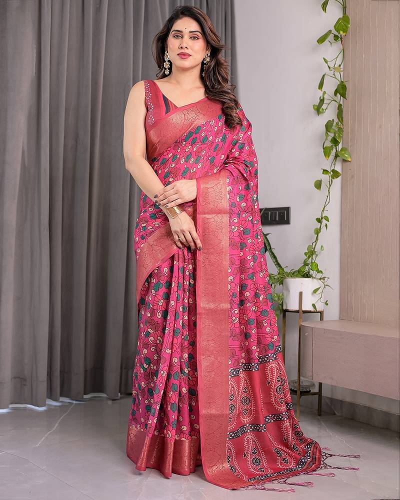 Premium floral print handloom linen weaved with golden zari saree with pallu tassels 5.5m