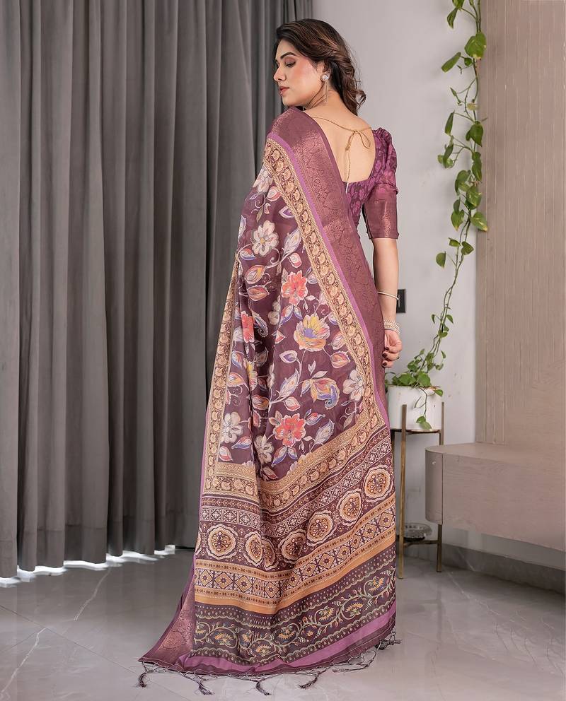 Premium floral print handloom linen weaved with golden zari saree with pallu tassels 5.5m