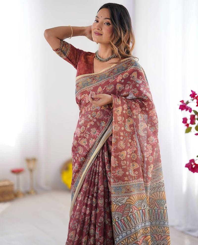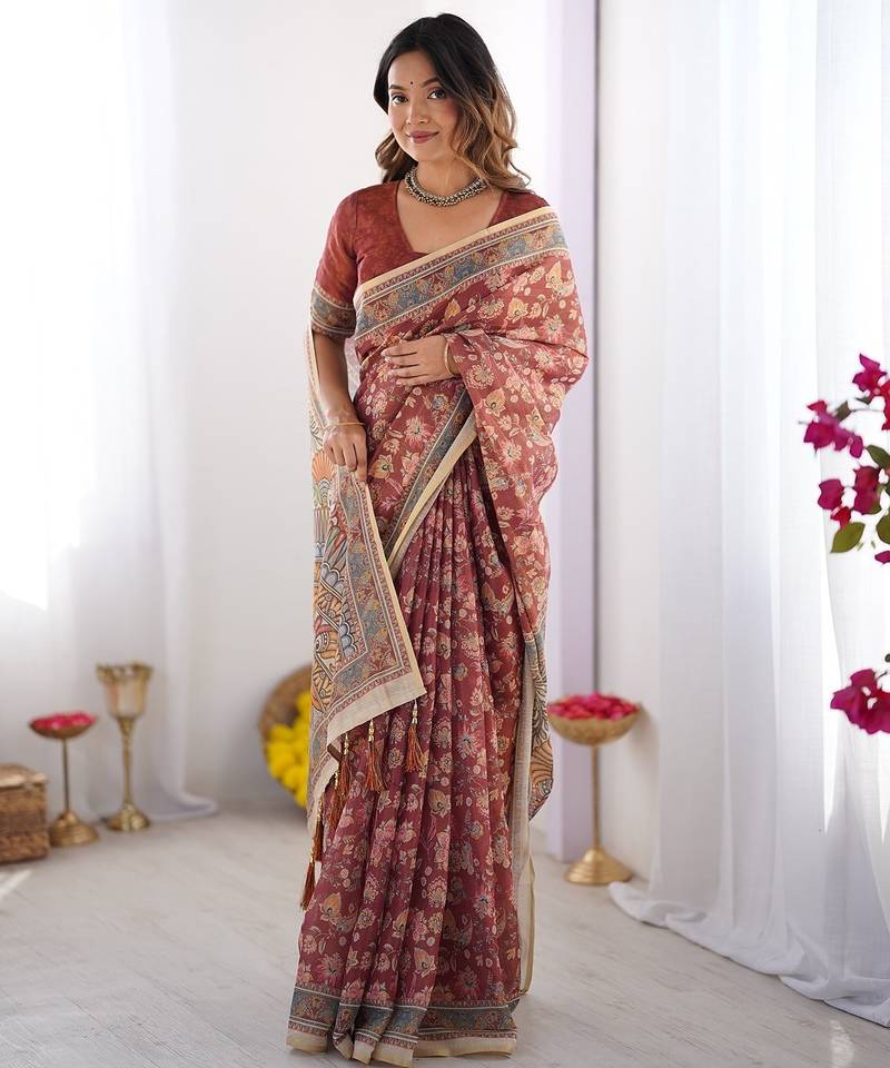 Printed floral handloom cotton saree with stylish tassel finish ready to wear