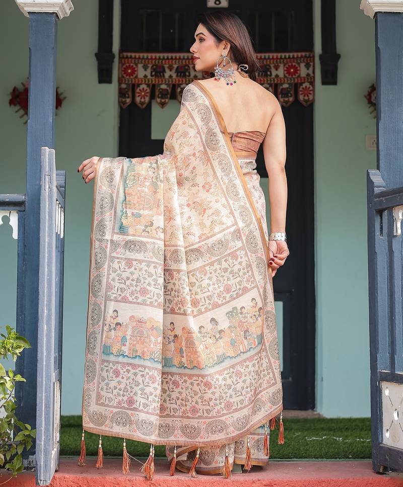 Printed floral handloom cotton saree with stylish tassel finish ready to wear
