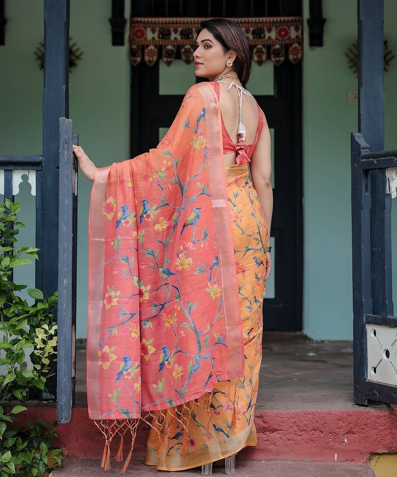 Printed floral handloom linen saree with stylish tassel finish ready to wear