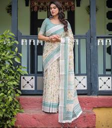 Printed floral handloom linen saree with stylish tassel finish ready to wear