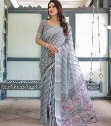 Printed floral handloom linen saree with stylish tassel finish ready to wear