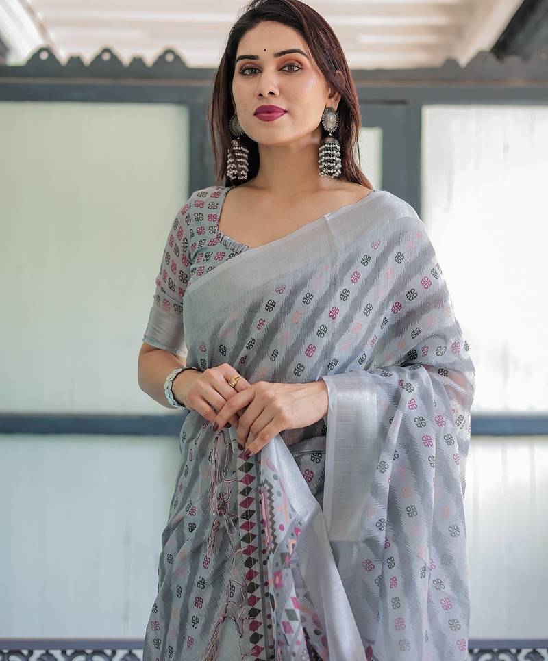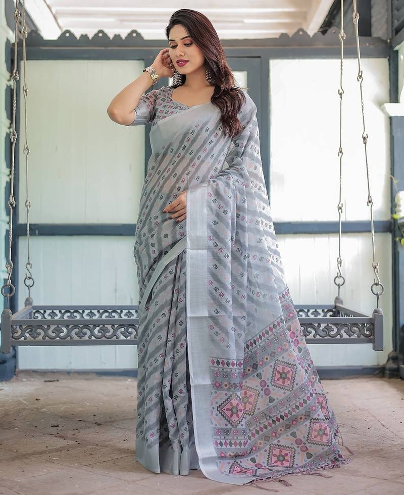 | Product Name | Printed Floral Handloom Linen Saree With Stylish Tassel Finish Ready To Wear | |