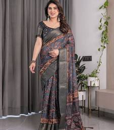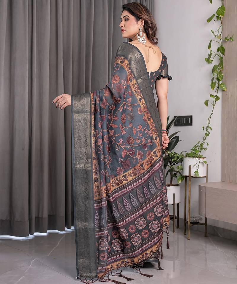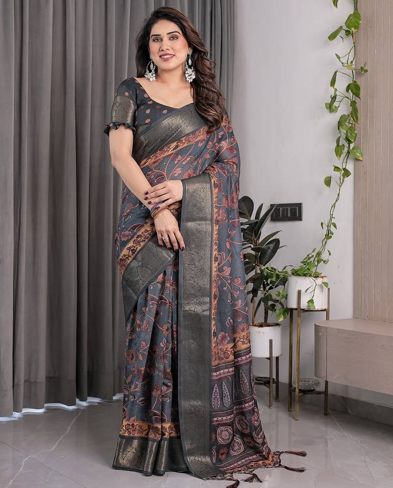 Printed floral handloom linen weaved with golden zari saree with stylish tassel finish ready to wear